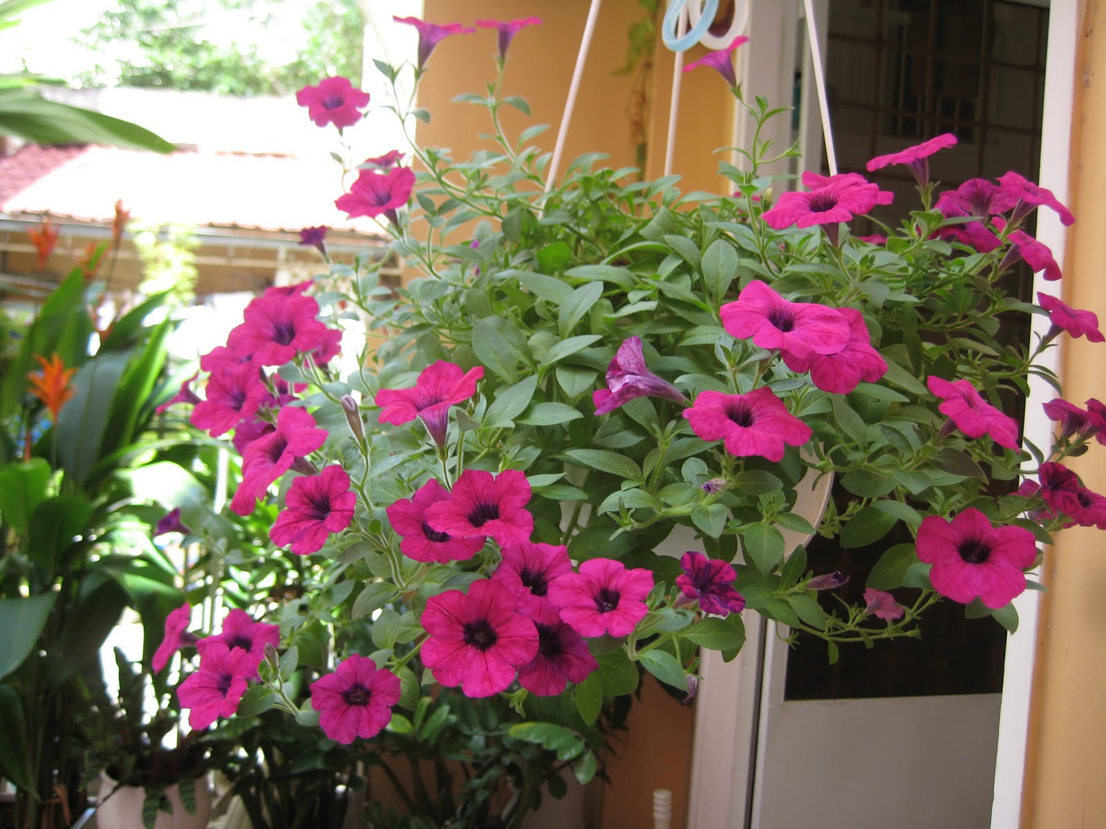 Trước cửa nhà mẹ rất thích trồng một giỏ hoa treo lủng lẳng, Giỏ hoa này trồng nếu chăm sóc tốt thì nó nở hoa liên tục khoảng 4 tháng thì cây mới tàn. Mẹ chỉ biết mua về – treo lên thôi , còn tưới cây toàn nhờ ông Năm mỗi sáng sớm tưới cây dùm mẹ vì sáng nào mẹ cũng lật đật đi làm . Tên hoa thì không biết nhưng chỉ thích ngắm thôi :))