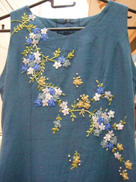 1. Chị ui, hoa năm cánh đẹp thế, trông như cánh hoa mai ấy mà, xinh quá thể!!!ribbon lụa thêu lên nhìn mềm mại quá ha chị! Không biết khi nào em mới đủ can đảm để thêu ribbon lại nè chị ui. Sau cái bộ chăn/gối khủng hoảng kia, em sợ quá xá sợ luôn rồi á …hic ..hic …Mà thấy cái áo này chị thêu hoa đẹp quá, lại mong có cái áo dài thêu ribbon đây nè ……hu hu hu … Có ai cứu em không?