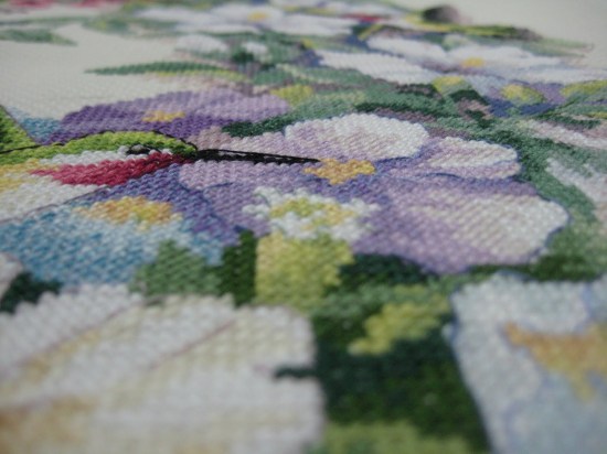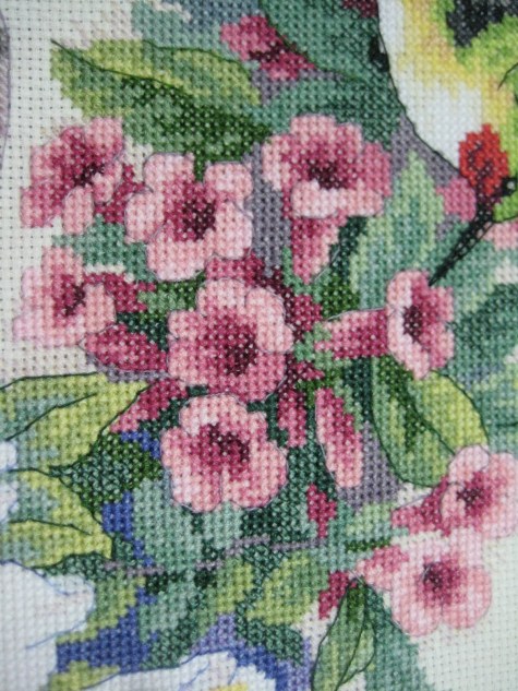 Thêu tấm này hồi hộp lắm vì kit xịn của DIM, aida 18 nhưng mẹ cháu bạo dạn đổi qua aida 14 và thêu trong sự thoi thóp vì sợ thiếu chỉ. Cuối cùng thì có những màu còn đúng 1 sợi chỉ ngắn ngủn, có những màu thì phải vay mượn qua DMC 2-3 sợi gì đó :)) . Nhưng hoa mà, hoa thì màu sắc lung linh lắm nên cái sự vay mượn đó thì chẳng ai biết. Nếu không nói ra thì chả ai biết cái thằng đang nằm trong đống rơm đó đâu nhỉ :))