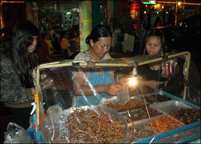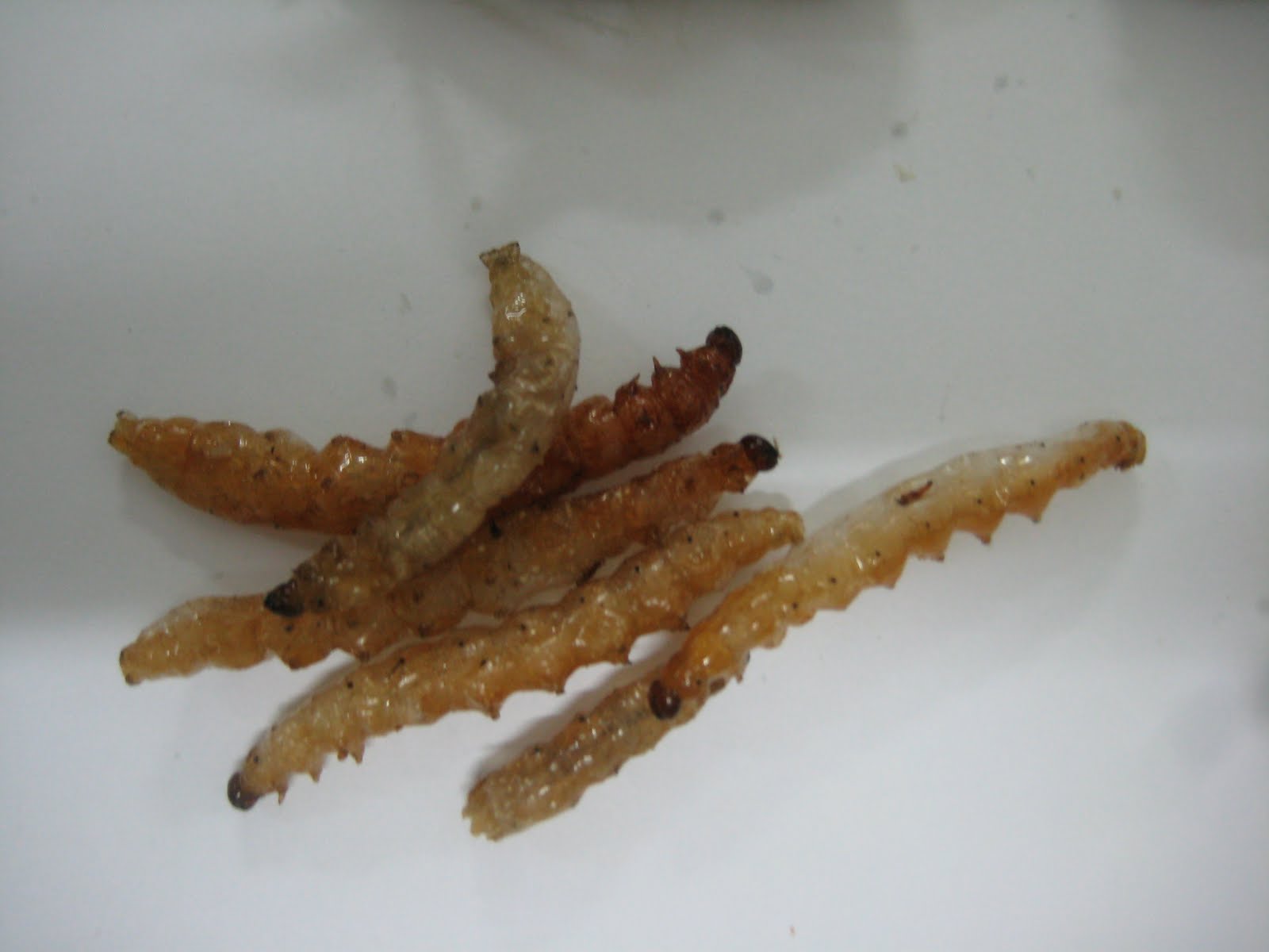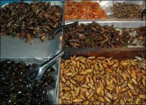 Dế chiên dòn, vào VN thì được nhét thêm hột đậu phọng và chiên bơ – món này thì OK lắm vì đã ăn rồi. Đối với dân Thái Lan thì cái món côn trùng này là món bình dân, được xe đẩy bán dạo tùm lum phố phường và cũng là món khoái khẩu của các cô gái bán bar nhất vì có quan niệm : giàu protein nên các cô cật lực ăn cái món bổ dưỡng này. Biết thế mua nhiều cho đối tượng ăn nhỉ 🙂 .