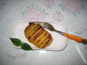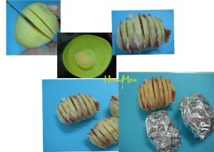2.Cắt khoai thành từng lát sâu chừng 3/4 củ khoai ( cắt sâu quá sẽ đứt luôn củ khoai nhe), mỗi lát cách nhau 0,5cm> Bảo đảm sau khi cắt lát thì củ khoai vẫn còn nguyên củ