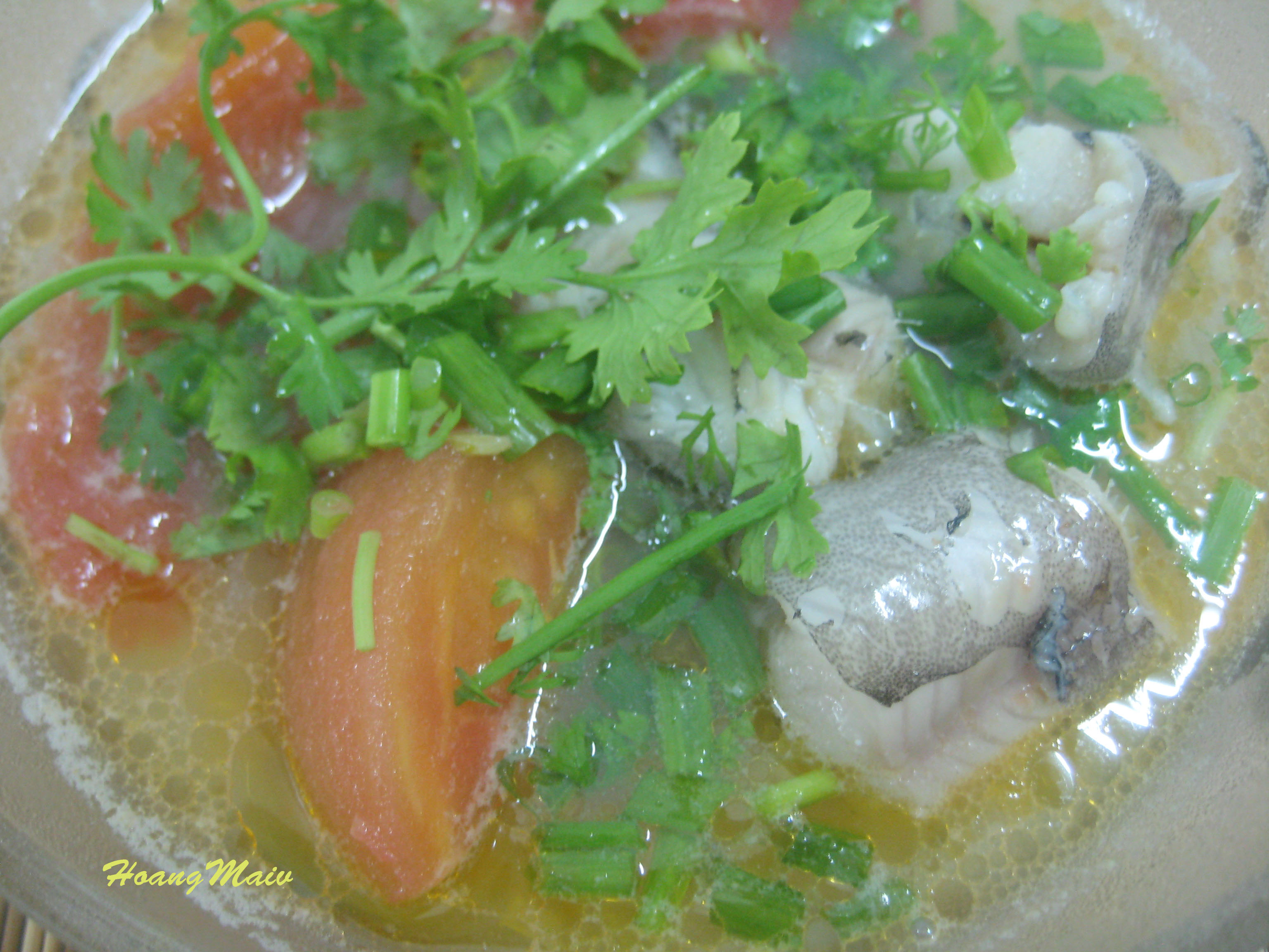 Nồi canh sôi lên thì cho chỗ cá đã tẩm ướp vào, cùng với nắm thì là, hành tươi và rau răm thái nhỏ. Cá chín tới là được. Để sôi lâu quá thịt cá sẽ tan trong nước hết.